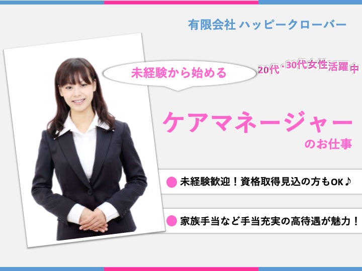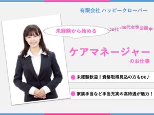 ケアマネージャー|訪問介護|大阪市平野区瓜破東|駅チカ|日勤のみ|月給25万〜可|資格取得見込みもOK|介護サービスハッピークローバー平野