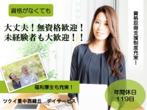 介護職|デイサービス|豊中市西緑丘|資格経験不問|月9日休|日勤|ツクイ豊中西緑丘 デイサービス