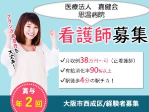 看護師/病院/駅チカ/月給38万円〜可/有給消化率90%以上/託児所あり/経験者募集|大阪市西成区松|思温病院
