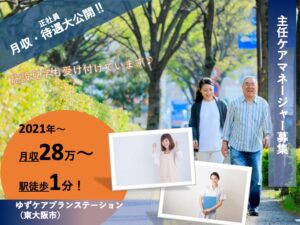 主任ケアマネージャー/居宅介護支援/うれしい土日休み/駅徒歩1分の駅チカ/月給28万〜可/マイカー通勤可/未経験歓迎|泉佐野市下瓦屋|ゆずケアプランステーション